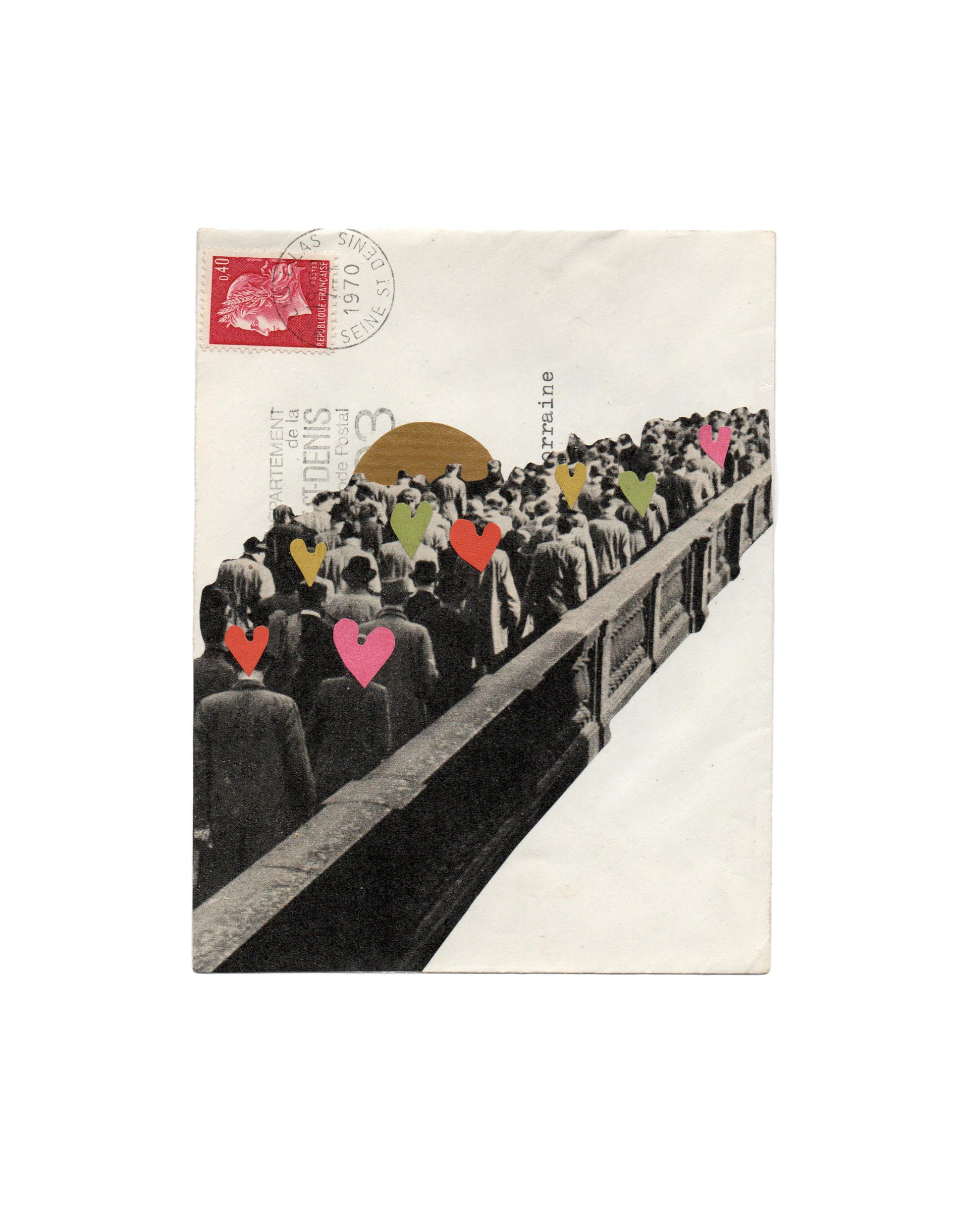 Collected imagery from books, vintage magazines and selected papers which were cut by hand and arranged in the studio on a vintage envelope before attaching the original collage to 240gsm fine art white card