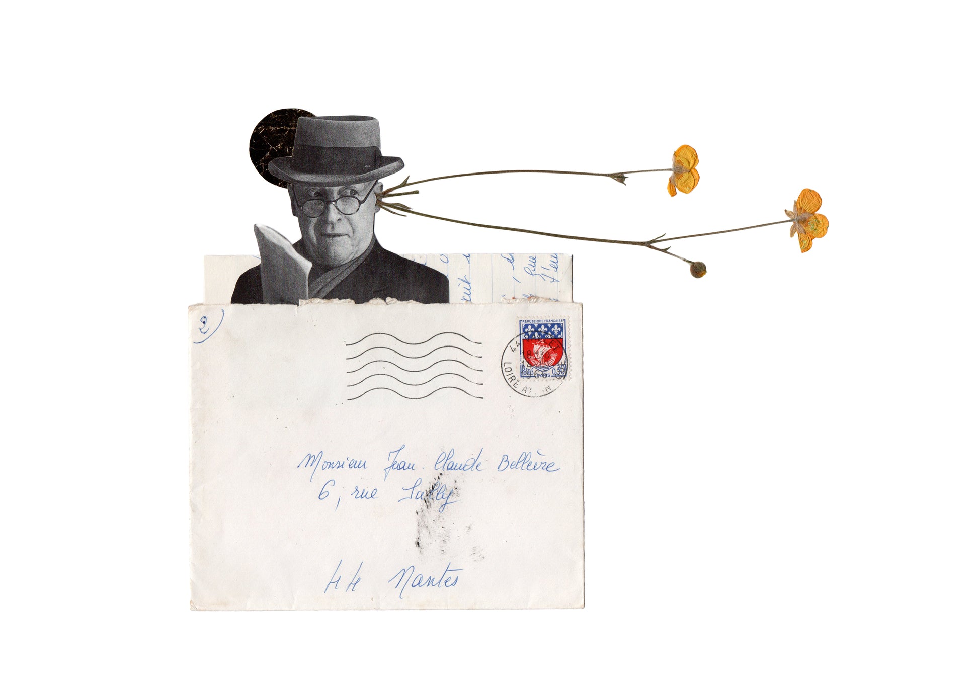Collected vintage magazine photograph, original vintage envelope and love letter and a gold leaf halo were cut, collaged and arranged on bright white art card before adding a stitched pressed natural form to finish the piece before photographing