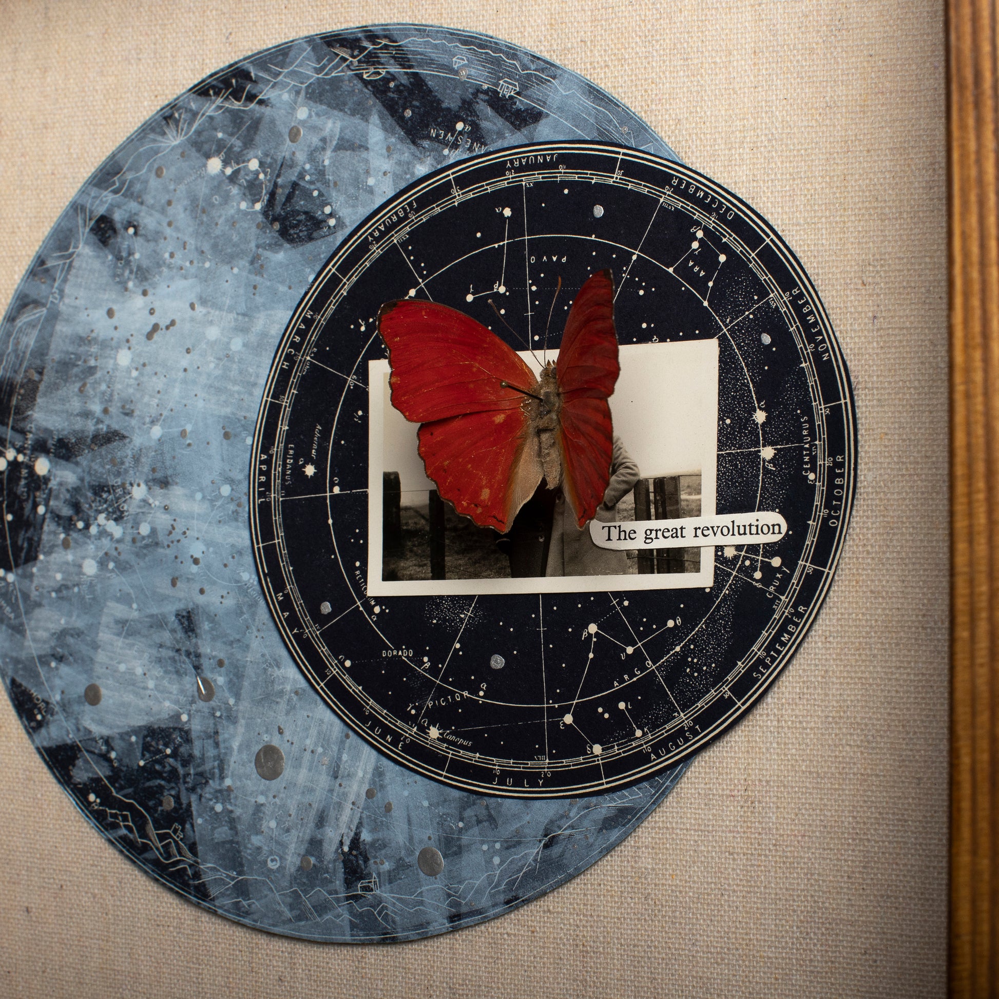 Collected star charts from an antique book which was cut, painted and collaged together with a vintage photograph and an ethically sourced taxidermy butterfly